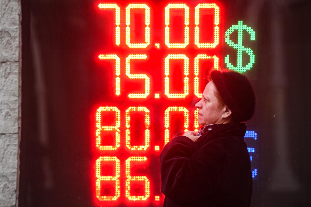 2020年3月9日,行人走过俄罗斯首都莫斯科一家外汇兑换点的汇率显示屏。新华社发