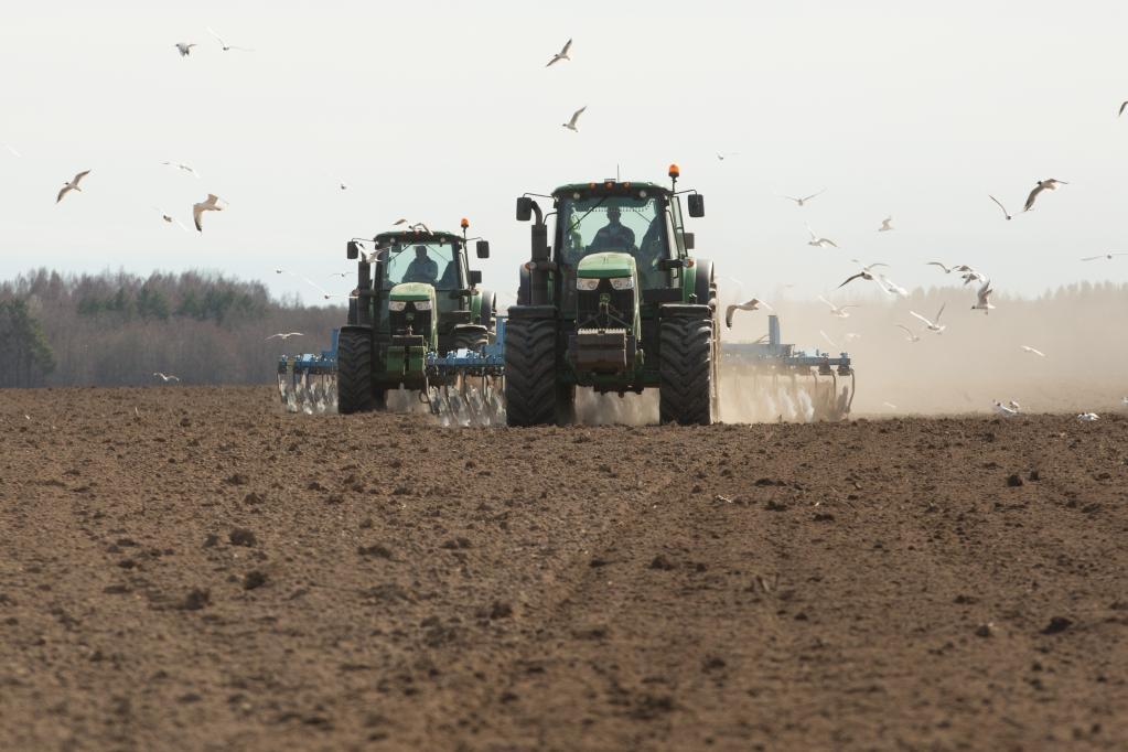 4月15日,农民在俄罗斯列宁格勒州一农场内播种春小麦。新华社发