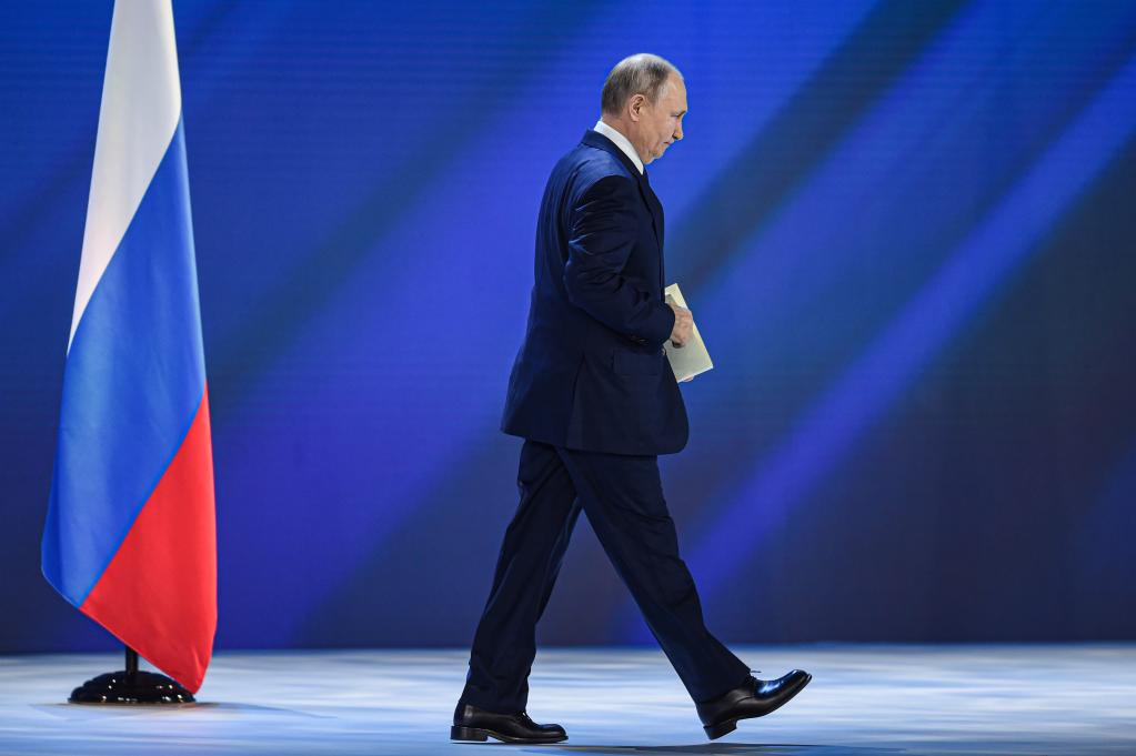 4月21日,俄罗斯总统普京在莫斯科准备发表国情咨文。新华社发(叶甫盖尼·西尼岑摄)