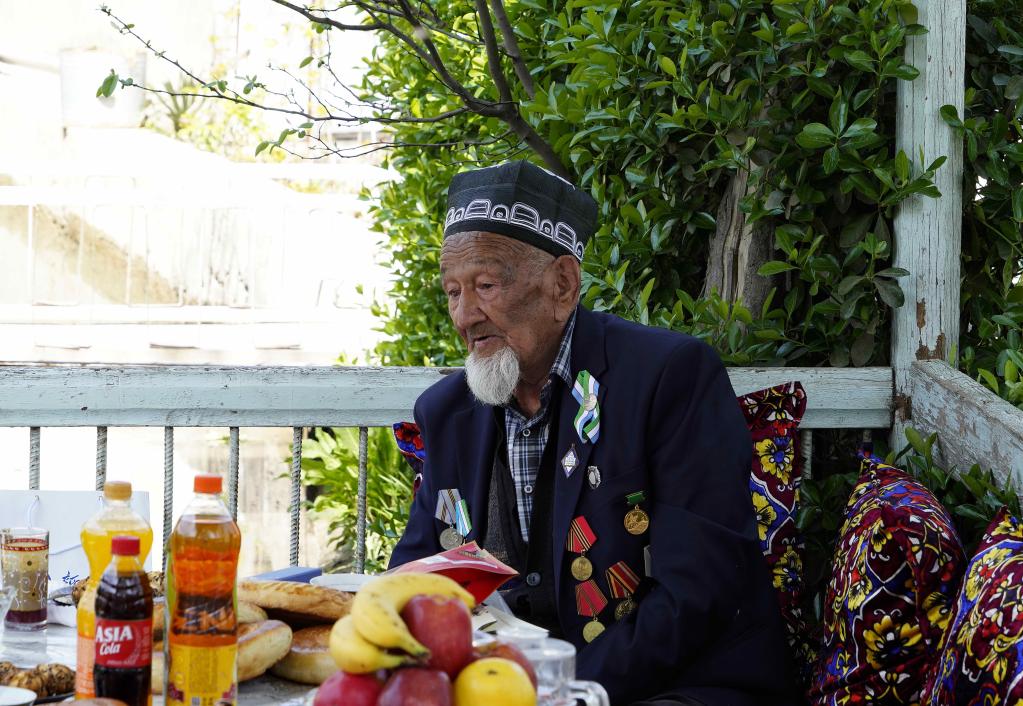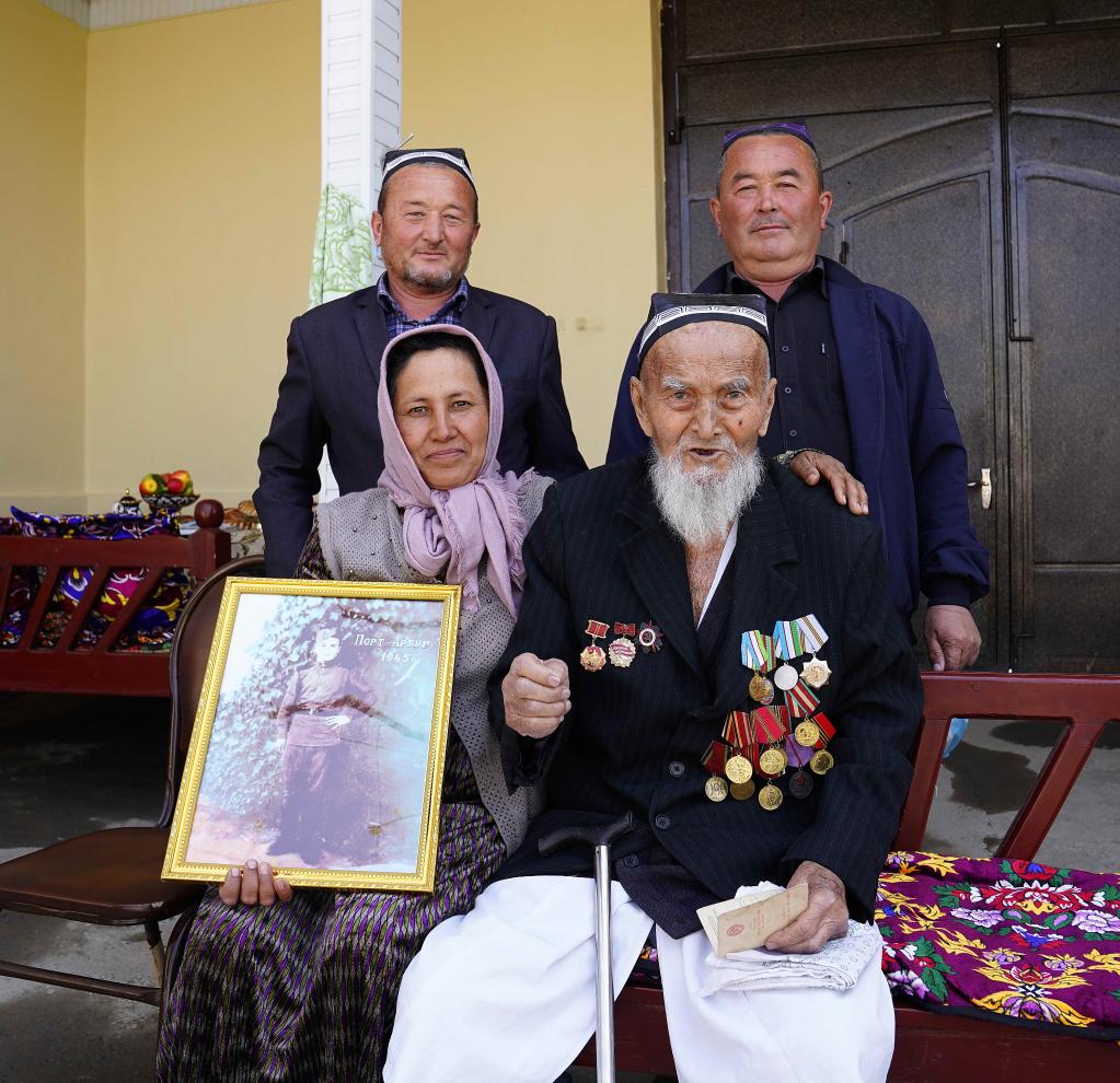 居住在乌兹别克斯坦东部安集延州的阿卜杜拉容·阿卜杜拉苏洛夫老人已经101岁,也参加了对日作战。他对70多年前在中国的经历记忆犹新。听闻有记者要来采访,他专门穿上了挂满勋章、纪念章和荣誉丝带的礼服。