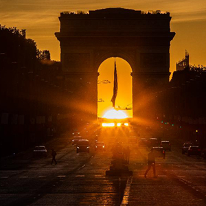这是5月8日在法国巴黎香榭丽舍大街拍摄的凯旋门落日景象。