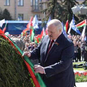 5月9日,白俄罗斯总统卢卡申科在明斯克向胜利纪念碑献花。
