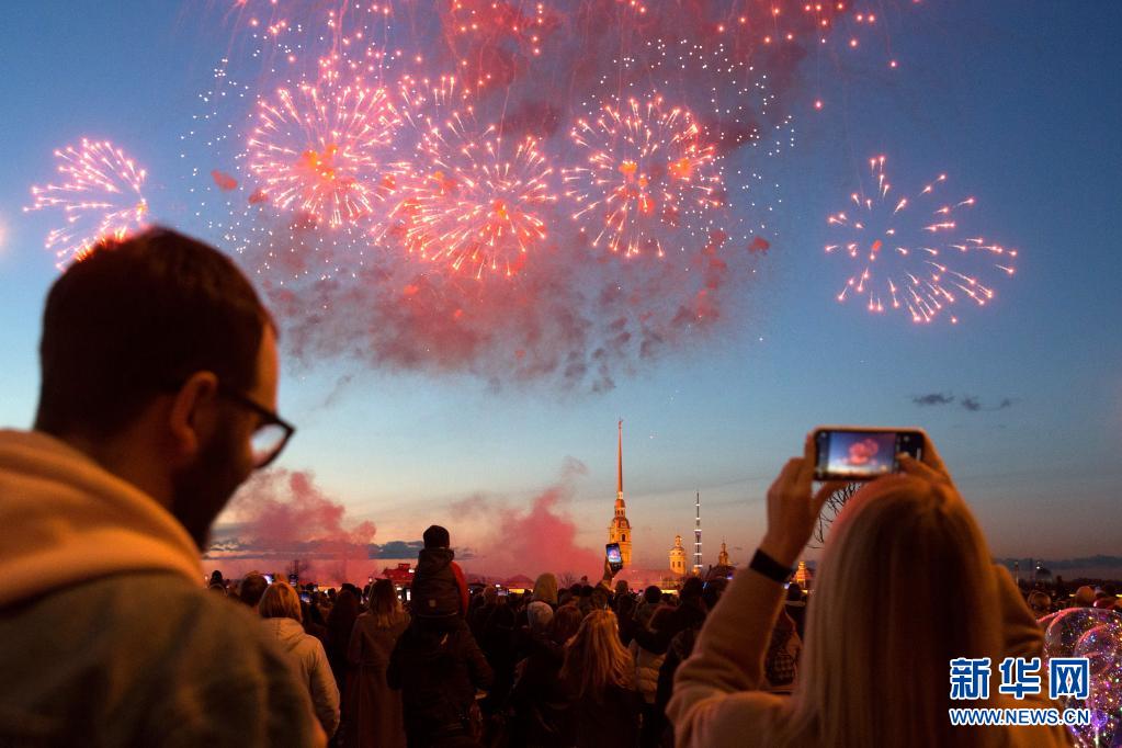 当日,俄罗斯圣彼得堡燃放烟花,纪念卫国战争胜利76周年。