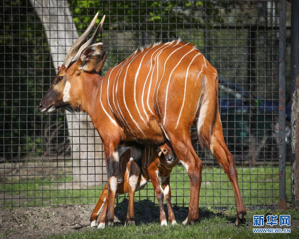 5月10日,两周大的幼年山地紫羚与母亲一起在波兰首都华沙的华沙动物园的笼舍中散步。