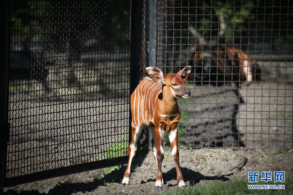 5月10日,两周大的幼年山地紫羚在波兰首都华沙的华沙动物园的笼舍中散步。