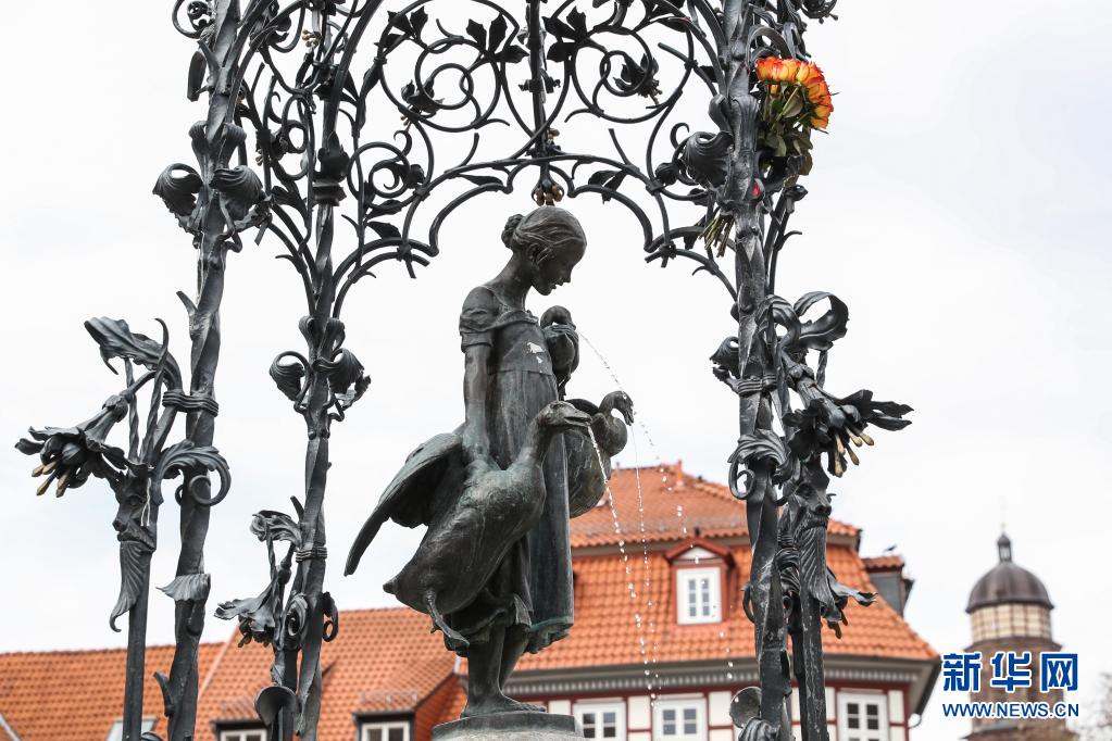 这是4月16日在德国哥廷根拍摄的哥廷根地标“牧鹅女”铜像。