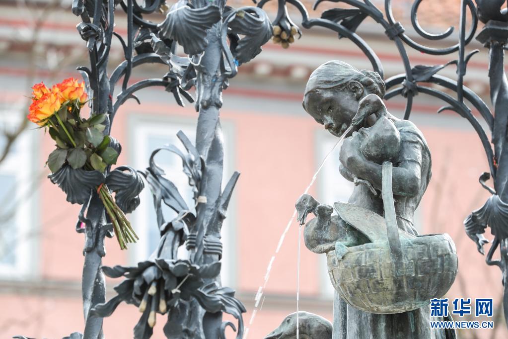 这是4月16日在德国哥廷根拍摄的哥廷根地标“牧鹅女”铜像。