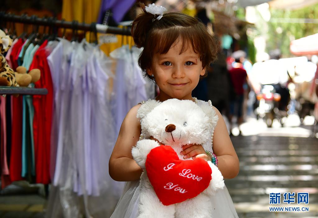 5月11日,一名女孩在叙利亚首都大马士革的市场上抱着刚刚买到的玩偶。