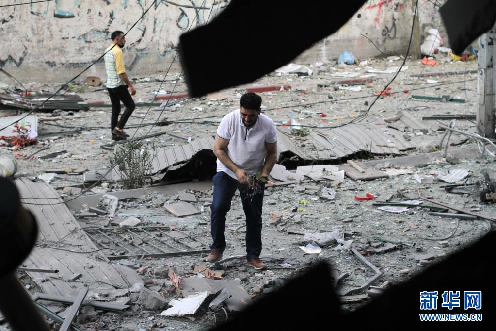 5月12日,在遭遇空袭后的加沙城,一名男子从废墟中取出个人物品。新华社发(里泽克·阿卜杜勒·贾瓦德摄)