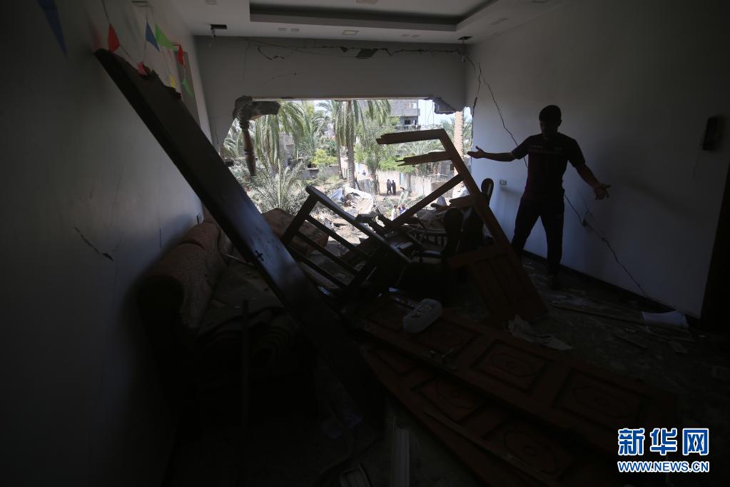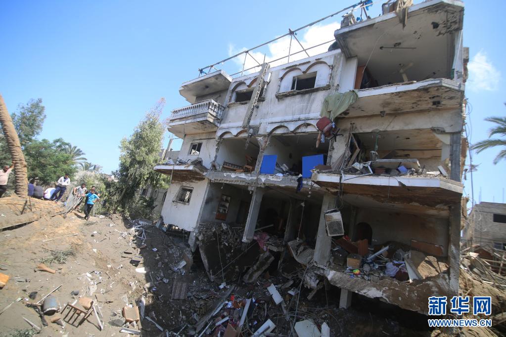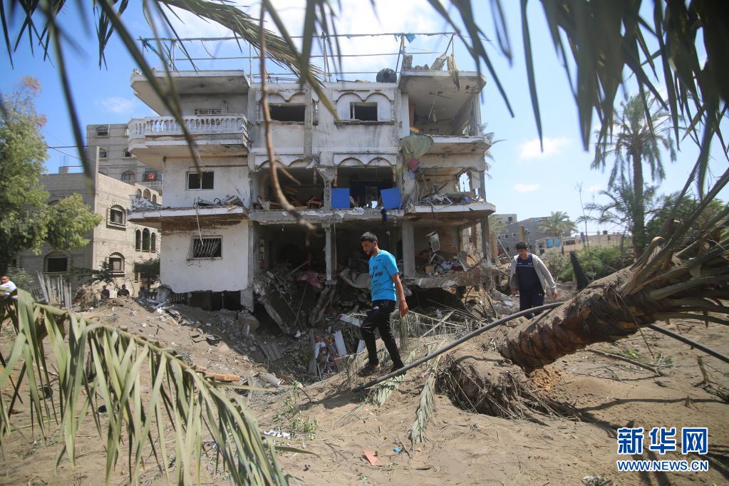 这是5月12日在加沙城拍摄的被空袭破坏的建筑。新华社发(里泽克·阿卜杜勒·贾瓦德摄)
