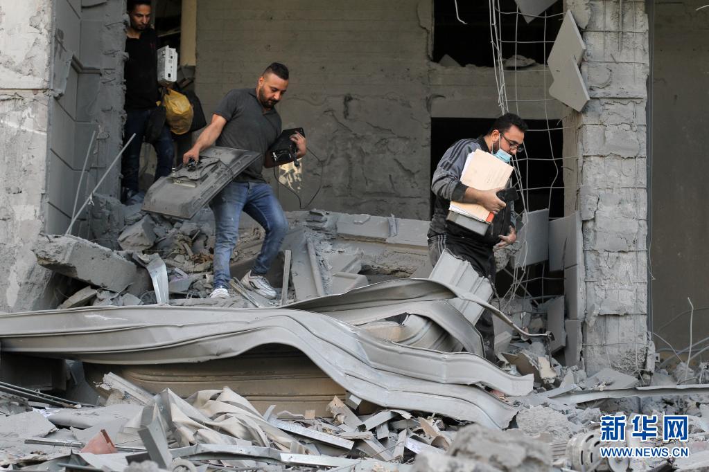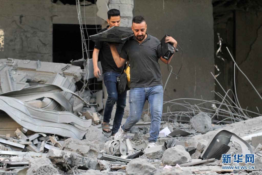 5月12日,在遭遇空袭后的加沙城,人们从废墟中取出个人物品。新华社发(里泽克·阿卜杜勒·贾瓦德摄)