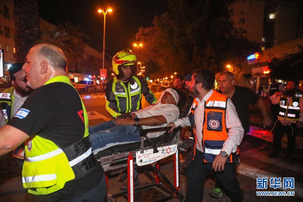 5月11日晚,靠近特拉维夫的以色列中部城市霍隆遭加沙地带火箭弹袭击后,救援人员运送伤员。
