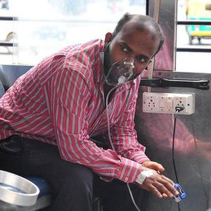 5月13日,印度班加罗尔的新冠患者坐在大巴车上吸氧。这辆大巴车为有吸氧需求的新冠患者提供免费的氧气服务。新华社发