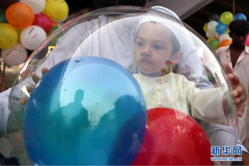 5月13日,在巴基斯坦南部城市卡拉奇,一名儿童在开斋节庆祝活动上玩气球。新华社发