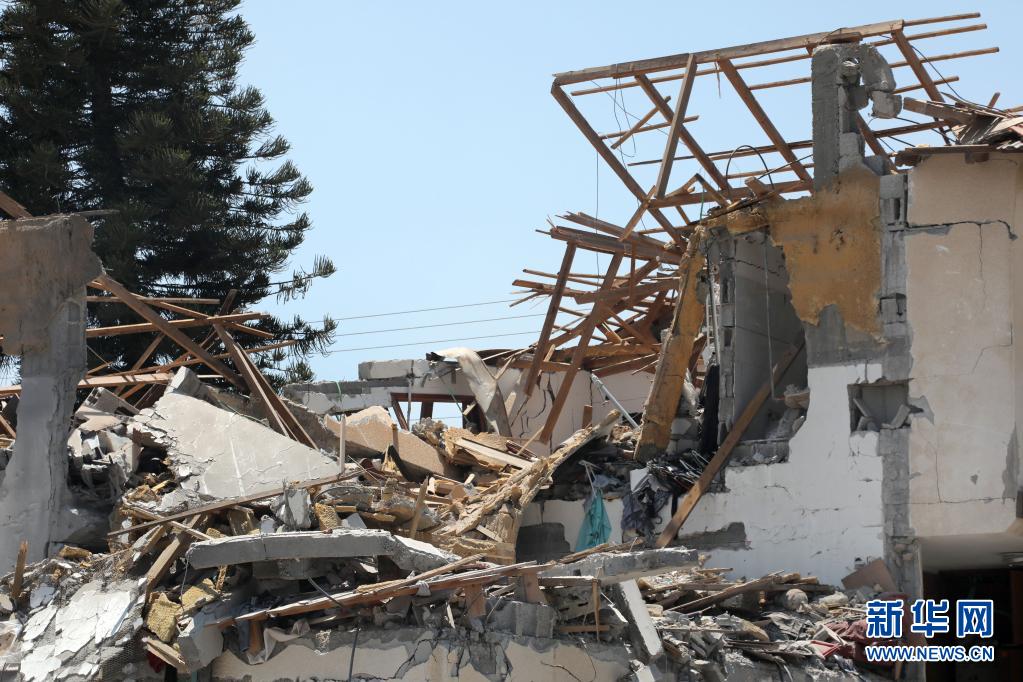 这是5月13日在以色列中部城市耶胡德拍摄的被火箭弹击中损毁的房屋。