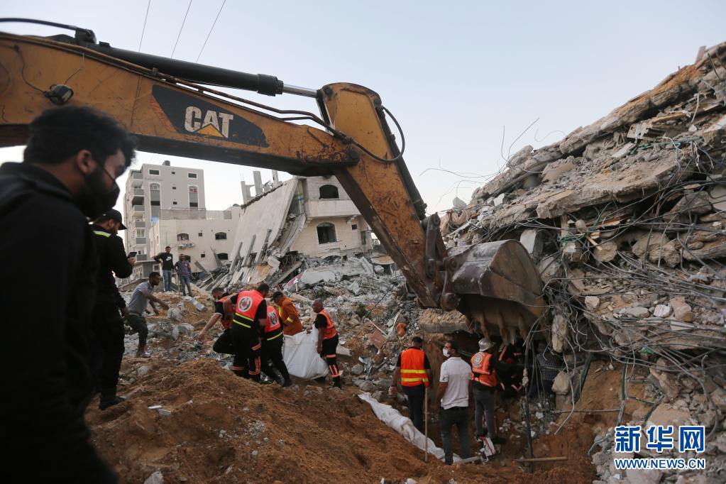 5月13日,救援人员在加沙地带城镇拜特拉希亚遭以军空袭的废墟中搜救。