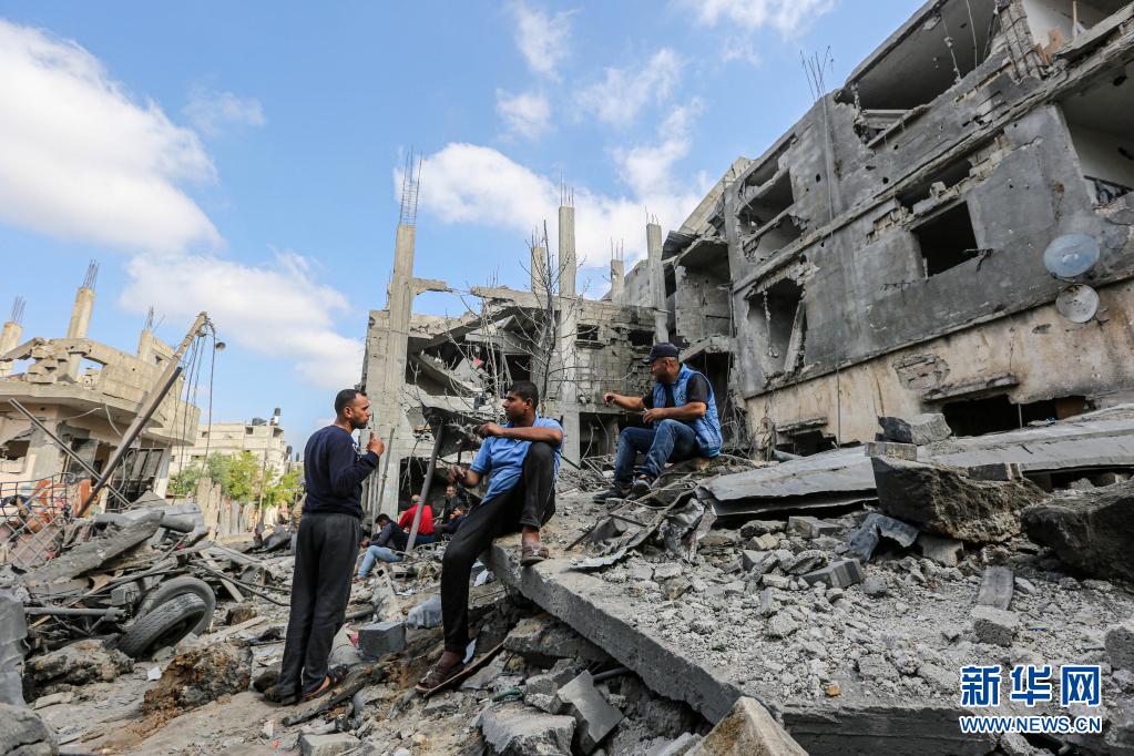 5月14日,巴勒斯坦人在加沙地带拜特哈嫩查看以军空袭后的建筑。