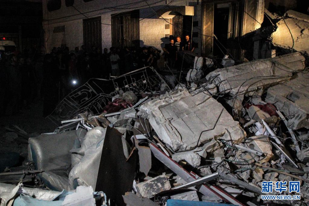 5月15日,人们聚集在加沙城一处遭空袭的难民营。