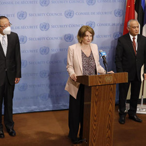 5月16日,在位于纽约的联合国总部,中国常驻联合国代表张军(左)同挪威常驻联合国代表莫娜·尤尔(中)、突尼斯常驻联合国代表拉德布共同会见记者。