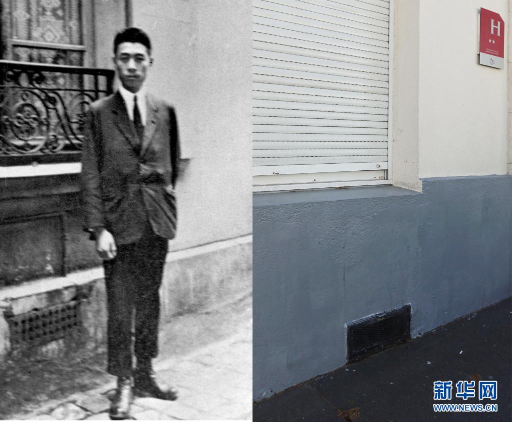 拼版照片显示的周恩来旅法期间在旅馆前留影的资料照片(左)和拍照地点现状(拍摄于2021年4月25日)。1920年,22岁的周恩来从上海启程赴法。他在1922年至1924年期间曾住在这家小旅馆。