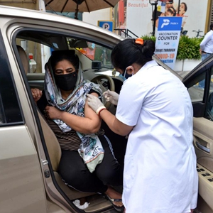5月17日,在印度诺伊达的一个“免下车”新冠疫苗接种点,医务人员为一名女子接种疫苗。