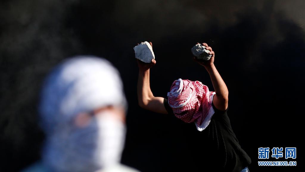 5月18日,一名巴勒斯坦示威者在约旦河西岸城市纳布卢斯附近的冲突中手持石块。