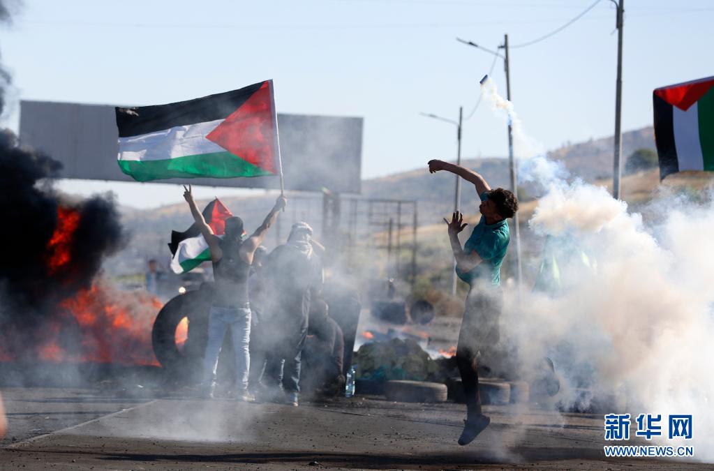 5月18日,一名巴勒斯坦示威者在约旦河西岸城市纳布卢斯附近的冲突中向以色列士兵扔回催泪弹。