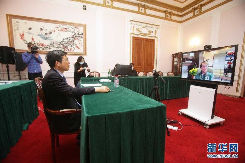 5月18日,中国驻乌克兰大使范先荣在基辅以视频形式出席“中乌豆类、谷物及油料贸易展望线上研讨会”。新华社发(谢尔盖·斯塔拉斯坚科摄)