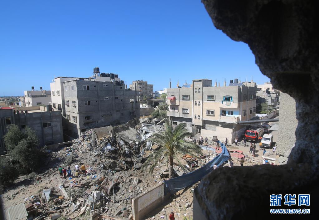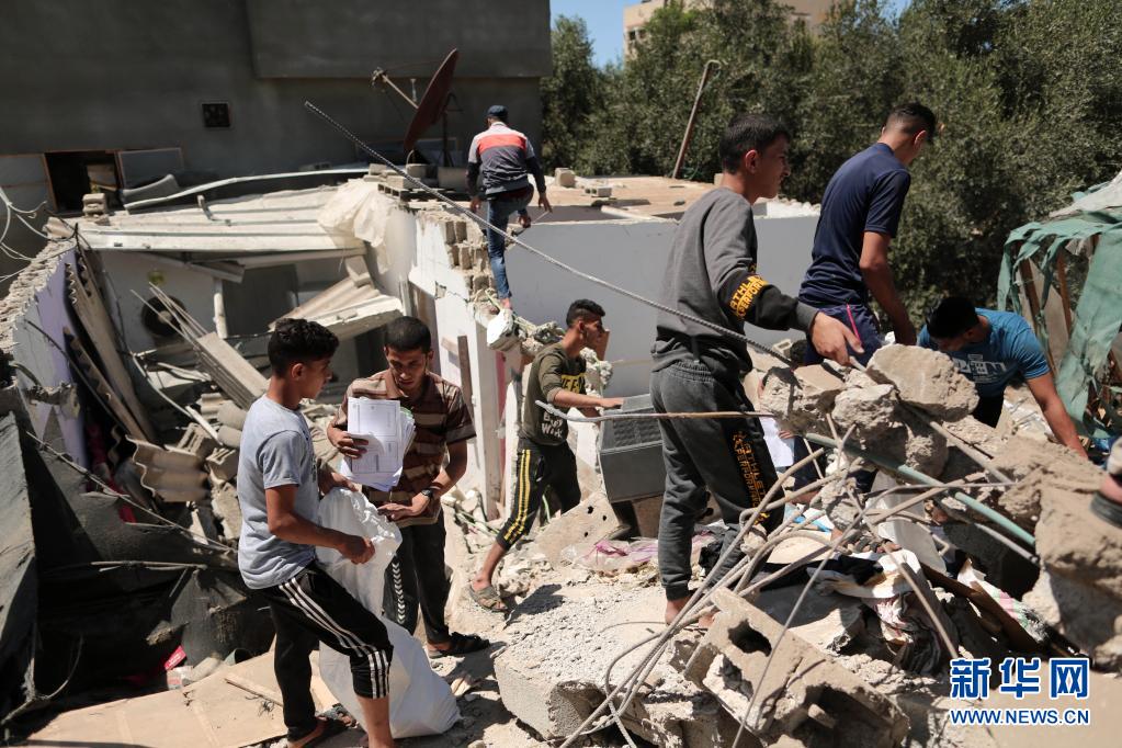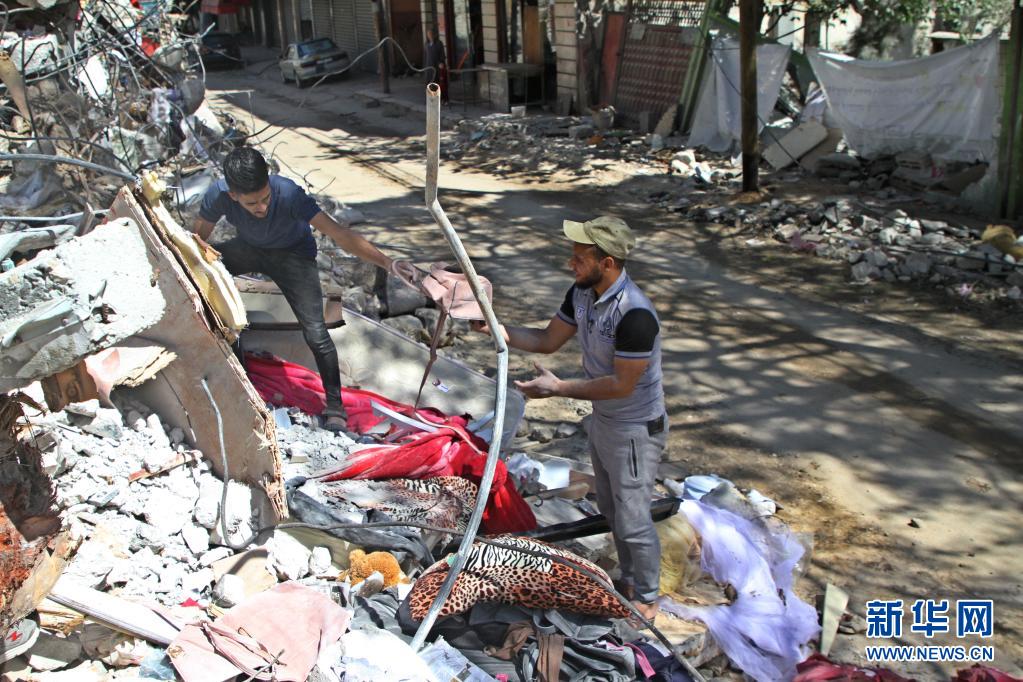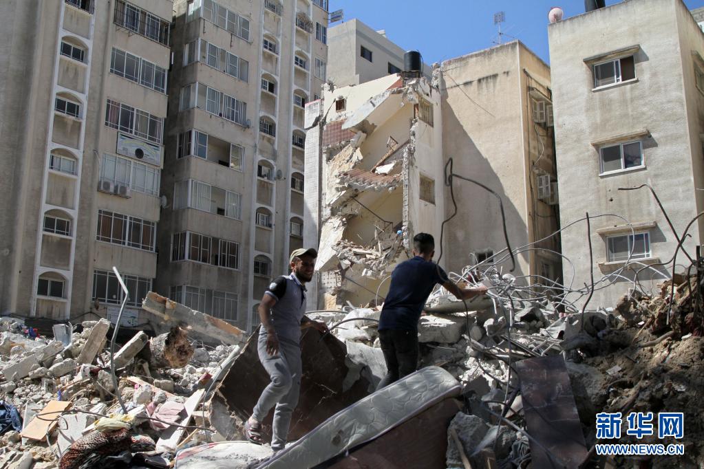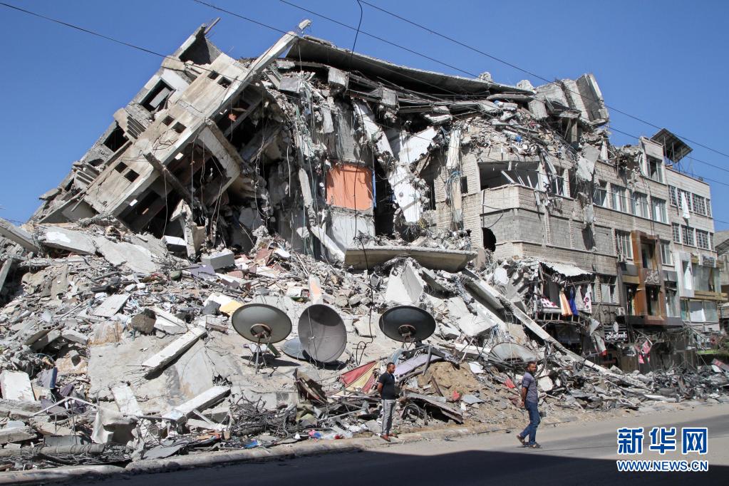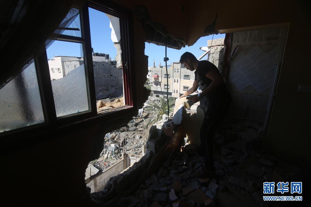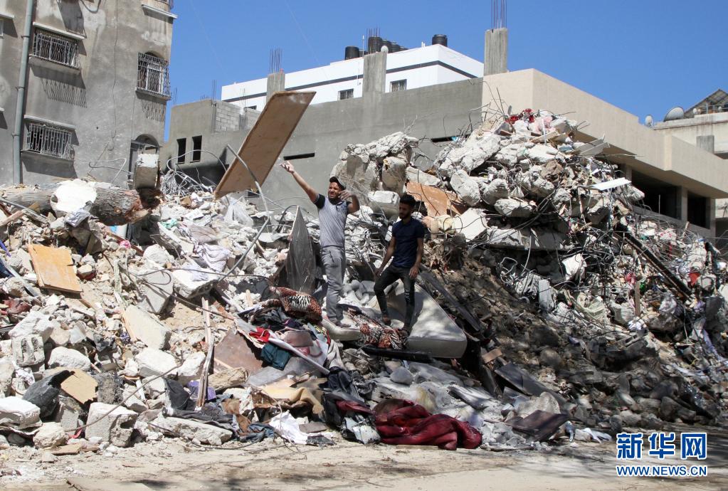 5月19日,巴勒斯坦人在加沙城查看遭空袭的建筑。新华社发(里泽克·阿卜杜勒·贾瓦德摄)
