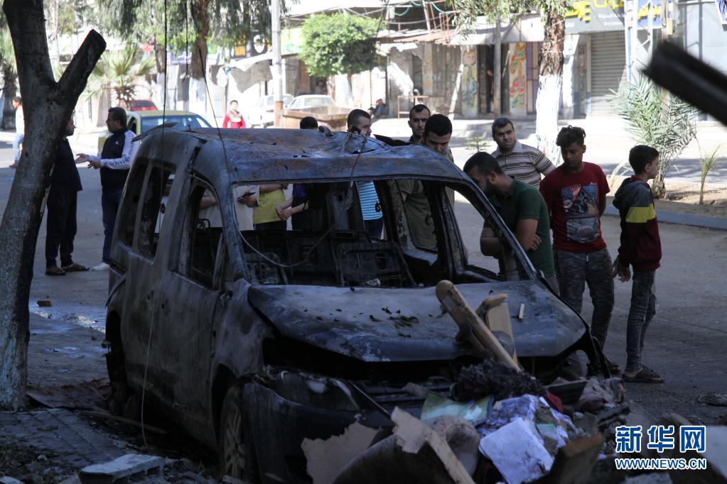 5月19日,巴勒斯坦人在加沙城查看在空袭中受损的车辆。新华社发(里泽克·阿卜杜勒·贾瓦德摄)