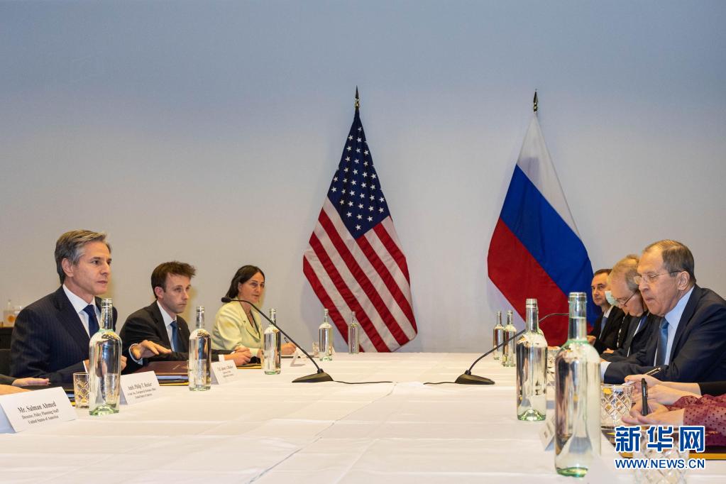 5月19日,美国国务卿布林肯(左一)和俄罗斯外长拉夫罗夫(右一)在冰岛雷克雅未克举行会晤。新华社发(冰岛外交部供图)