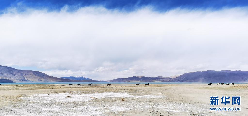 野马在佩枯错旁奔驰(5月14日摄,手机照片)。
