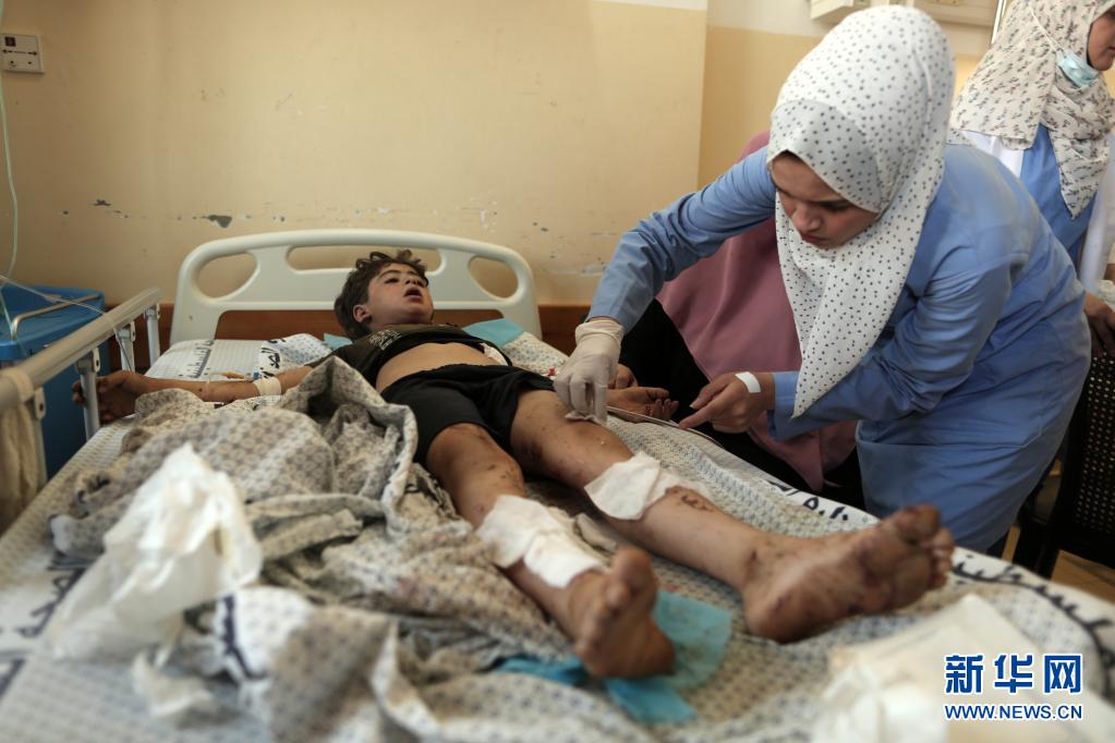 5月20日,一名因空袭受伤的巴勒斯坦儿童在加沙地带城市汗尤尼斯的医院中接受治疗。