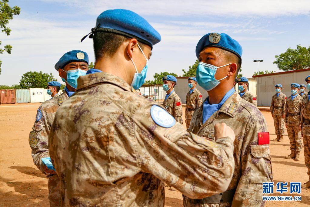 5月20日,在苏丹达尔富尔法希尔超级营地中国营区,维和工兵分队政委王文轩(左)为官兵们佩戴“和平荣誉勋章”。新华社发(万端武摄)
