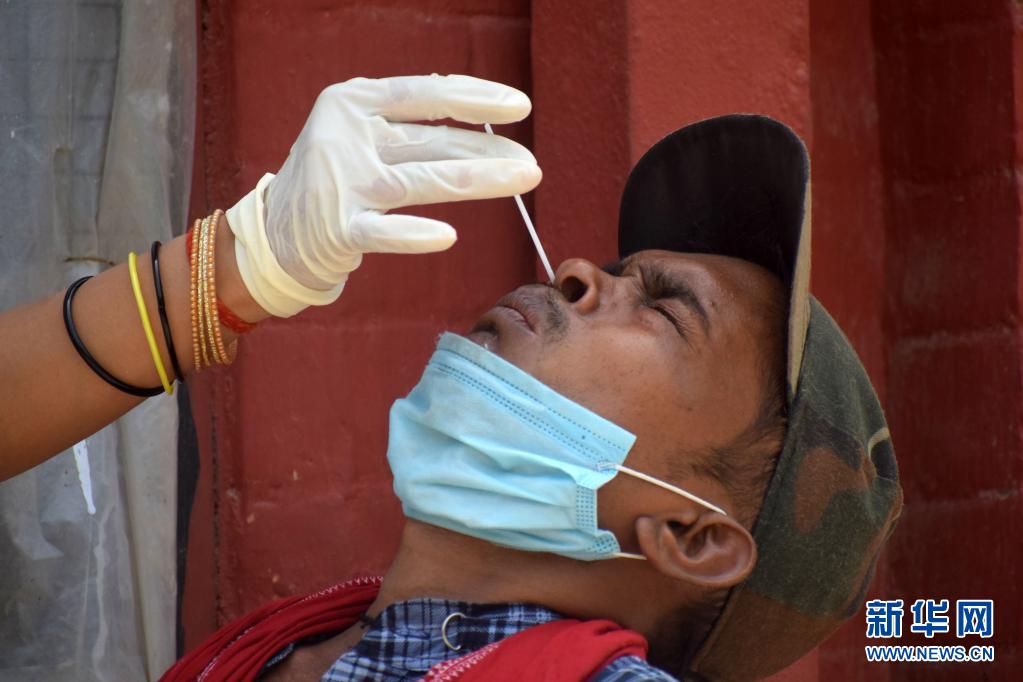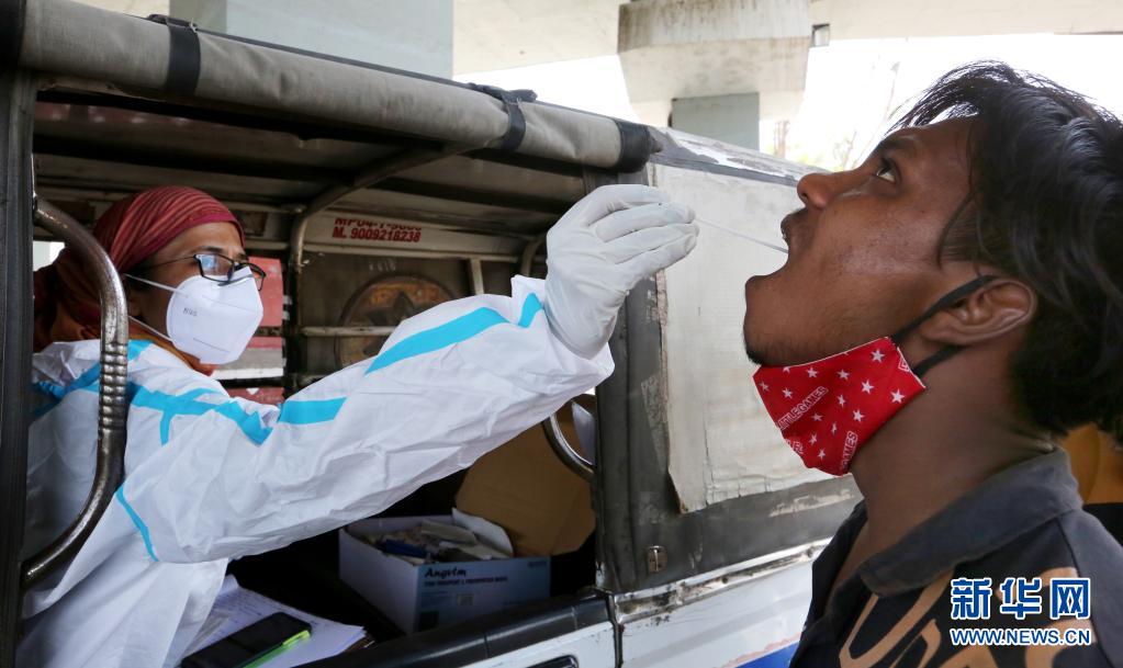 5月24日,医务人员在印度博帕尔为一名男子进行新冠检测取样。印度累计新冠死亡病例24日达到303720例,成为继美国、巴西后第三个累计新冠死亡病例数超过30万例的国家。新华社发
