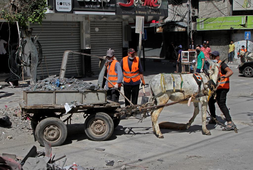 5月23日,巴勒斯坦志愿者清理加沙城一处遭到以色列轰炸后的建筑残骸。新华社发(里泽克·阿卜杜勒·贾瓦德摄)