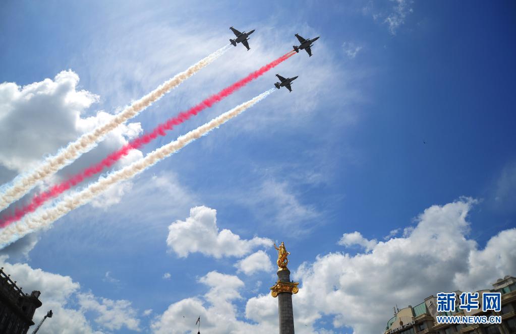5月26日,在格鲁吉亚首都第比利斯,格鲁吉亚军机飞过自由广场。