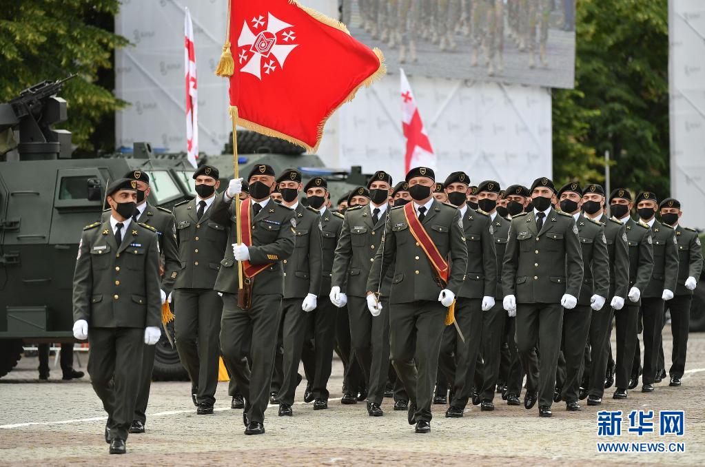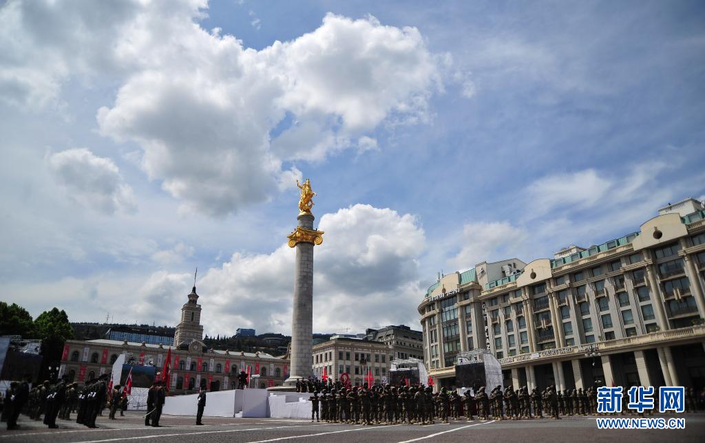 5月26日,在格鲁吉亚首都第比利斯,格鲁吉亚军队方阵在自由广场接受检阅。