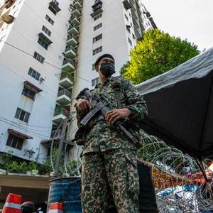 5月28日,士兵在马来西亚吉隆坡市郊一处因新冠疫情被封锁的小区执勤。新华社发(张纹综 摄)