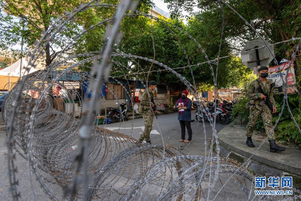5月28日,士兵在马来西亚吉隆坡市郊一处因新冠疫情被封锁的小区巡逻。新华社发(张纹综 摄)