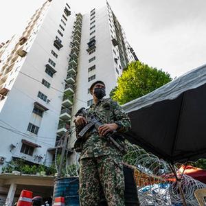 5月28日,士兵在马来西亚吉隆坡市郊一处因新冠疫情被封锁的小区巡逻。