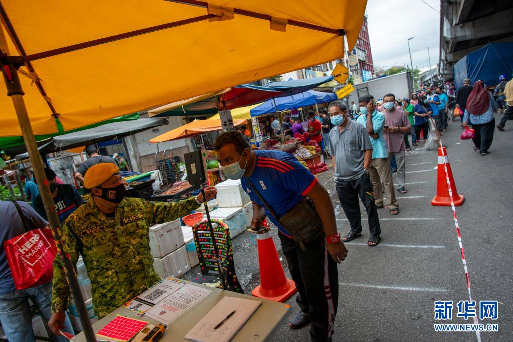 5月29日,市民进入马来西亚吉隆坡一处市场前排队检测体温。