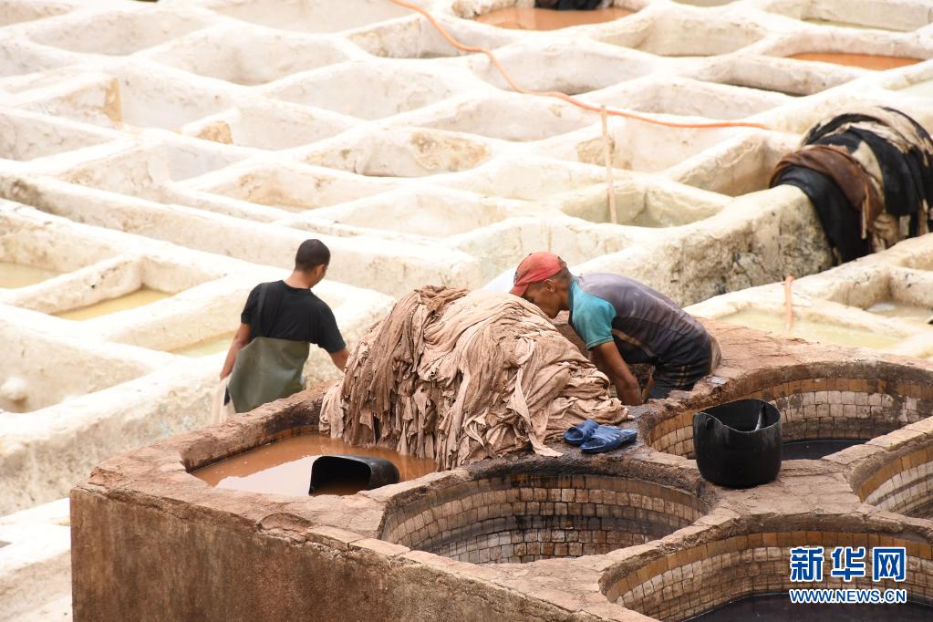 5月30日,工人正在摩洛哥非斯古城内的皮革染坊中劳作。