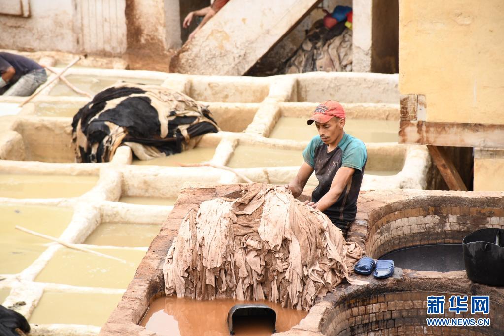 5月30日,工人正在摩洛哥非斯古城内的皮革染坊中劳作。