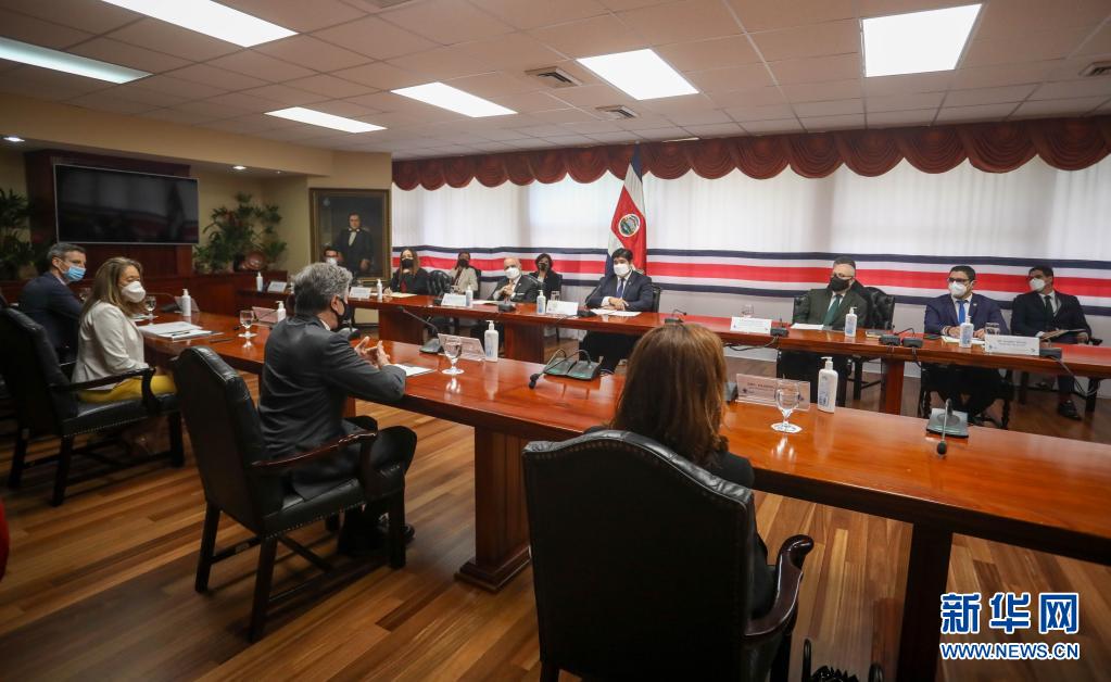 6月1日,哥斯达黎加总统阿尔瓦拉多(后排右四)在圣何塞与美国国务卿布林肯(前排右二)会谈。新华社发(哥斯达黎加总统府供图)