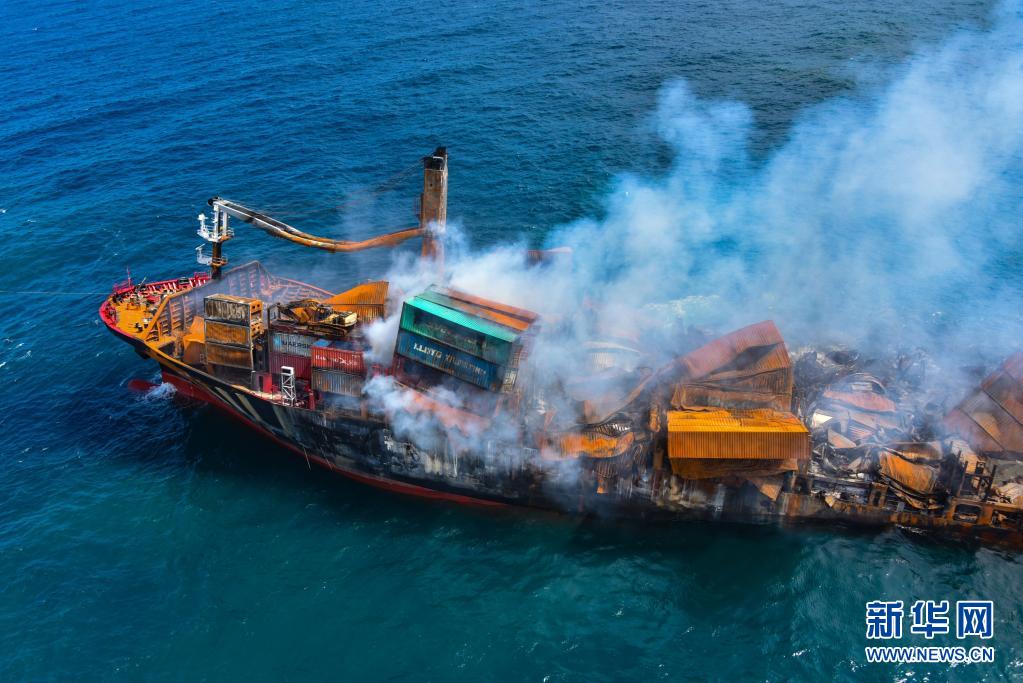 这是6月2日在斯里兰卡科伦坡港附近拍摄的逐渐下沉的起火货船“X-PRESS PEARL”号。