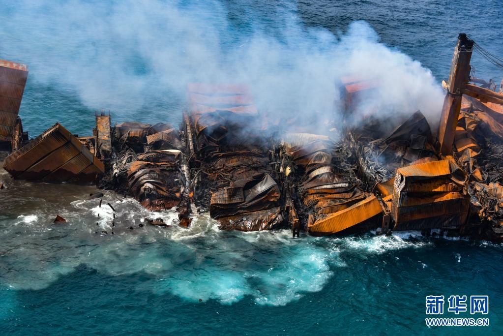这是6月2日在斯里兰卡科伦坡港附近拍摄的逐渐下沉的起火货船“X-PRESS PEARL”号。