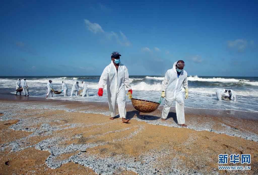 6月2日,工作人员在斯里兰卡科伦坡一处沙滩清理货船燃烧产生的废物。