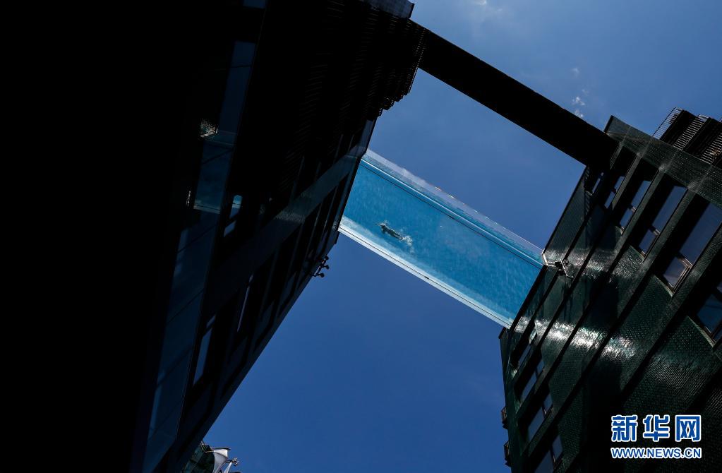 6月2日,一名女子在英国伦敦南部一个建造于两栋公寓楼之间的“空中泳池”游泳。