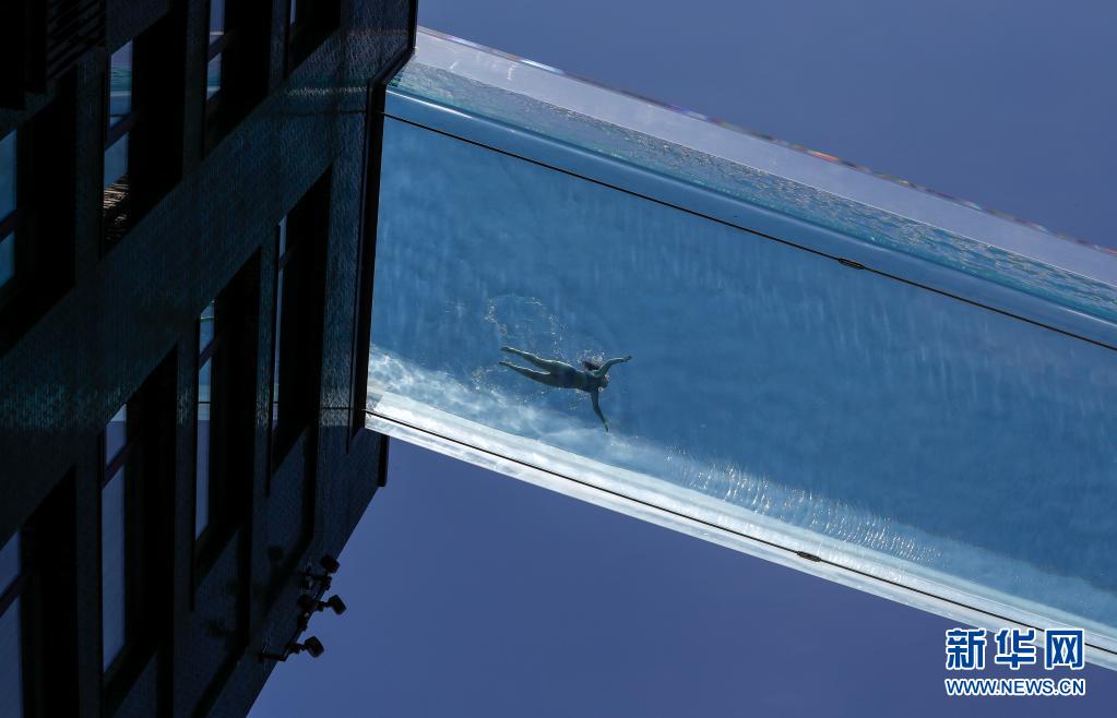 6月2日,一名女子在英国伦敦南部一个建造于两栋公寓楼之间的“空中泳池”游泳。